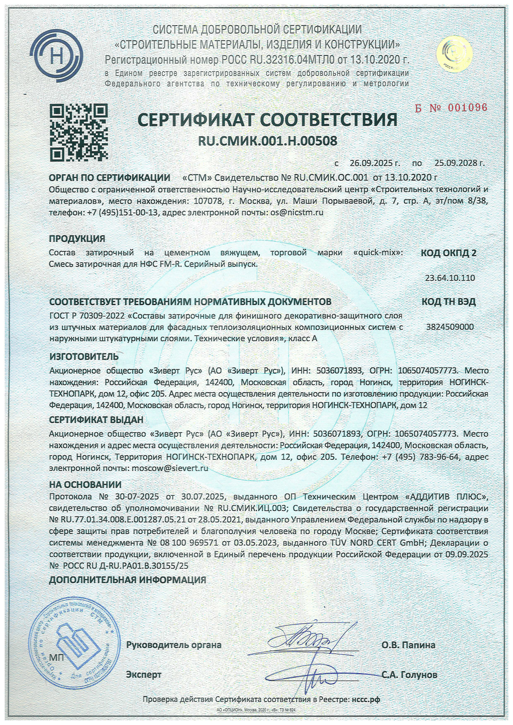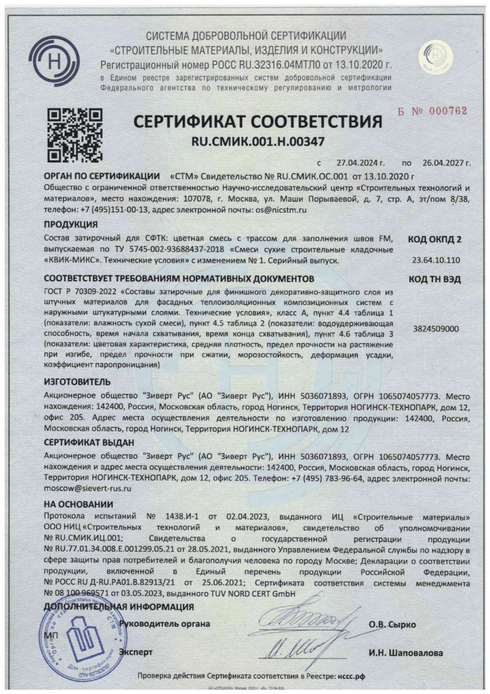 Сертификат соответствия Смесь затирочная для НФС FM-R