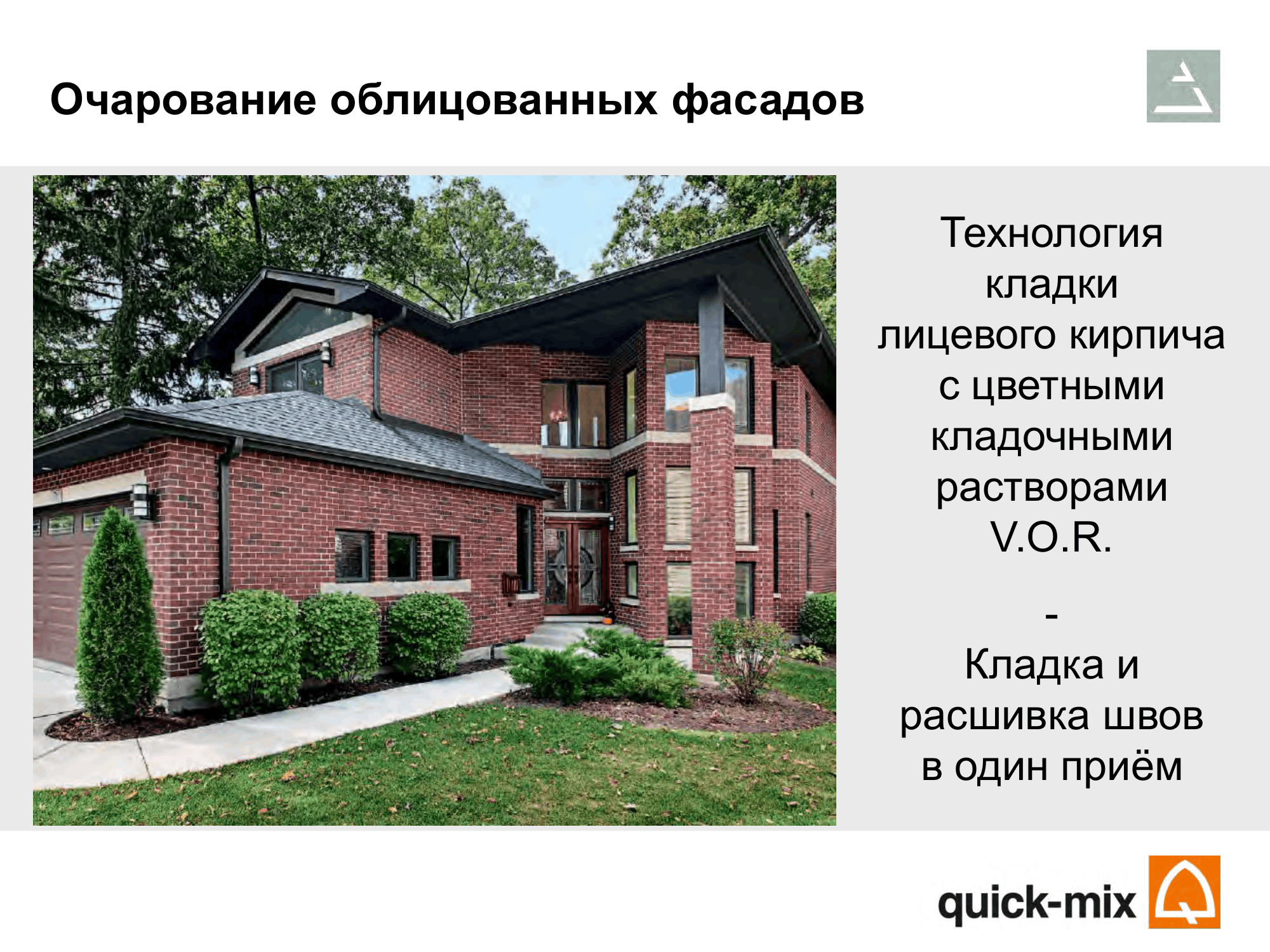 Наиболее востребованным продуктом quick-mix является система кладочных растворов V.О.R. для лицевого кирпича. В ее основе – четыре вида растворов, предназначенных для укладки кирпича разного водопоглощения. От клинкерного кирпича с чрезвычайно низким, до кирпича ручной формовки, обладающим значительной водопоглощающей способностью. Богатая цветовая гамма – 16 цветов растворов для кладки и заполнения швов, специально подобранный фракционированный заполнитель, а также оптимальное количество воды, позволяют выполнять лицевую кладку без появления высолов.